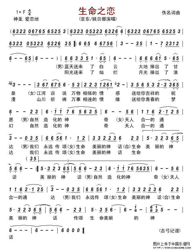 大地捧出了甘泉 姚贝娜: 江河诉说万物相依的情感 送给你吉祥的祝愿 亚 东:自然造化的神奇 姚贝娜:天人合一的通达 亚 东:我们永远传颂 姚贝娜:生命美丽的神话 合 唱:生命美丽的神话 亚 东:阳光送来了灿烂 月光捧出了浪漫 姚贝娜: 山川祈祷万世相恋的情缘 送给你青春的梦幻 亚 东:自然造化的神奇 姚贝娜:天人合一的通达 亚 东:我们永远传颂 姚贝娜:生命美丽的神话 合 唱:生命美丽的神话 亚 东:自然造化的神奇 姚贝娜:天人合一的通达 亚 东:我们永远传颂 姚贝娜:生命美丽的神话 合 唱:生命美丽的神话 传颂生命美丽 的神话
